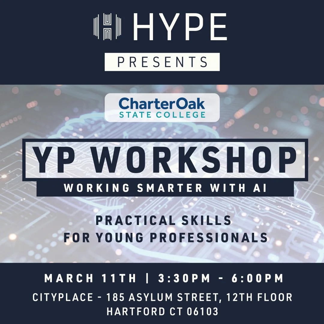Join HYPE for a professional development workshop designed for young professionals across the Hartford region, in partnership with Charter Oak State College and led by Dr. Dave Ferreira, provost of Charter Oak State College. This interactive session introduces participants to generative AI, the tools professionals are increasingly encountering in the workplace, and how AI is being applied across industries today.