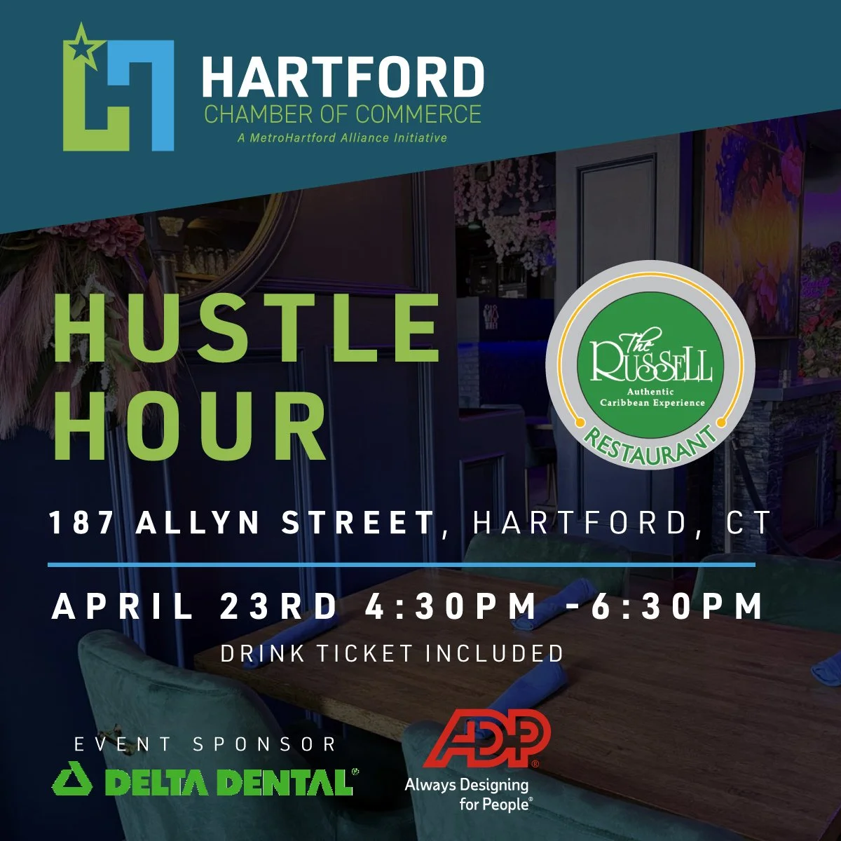 HYPE members are invited to join the Hartford Chamber of Commerce on April 23 at The Russell for an authentic Caribbean experience in the heart of downtown Hartford! Grab a bite to eat and mingle with our local business community while enjoying a drink—the first one is included with your ticket!